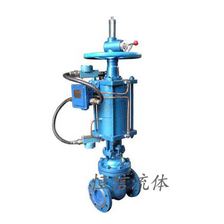 1、本閥主要由閥體、閥蓋、閘板、閥桿、密封圈、雙層氣缸及其活塞、活塞桿、隔板連同緩沖機構、手動機構、氣動-手動轉換裝置和閥蓋填料裝置等部分組成。2、上活塞行至行程上端可頂上上回訊器,使之發訊;下活塞行之行程下端可頂下下回訊器,使之發訊,以作為閘閥開閉信息在中央操作室的模擬儀表盤上進行顯示。3、手輪上部的外伸指示桿的上升和下降,標志著該閥的閘板是處于提升狀態還是下降狀態。閘閥關閉時,外伸指示桿位于最低位置;反之,閘閥全開時,外伸指示桿位于最高位置。此即為本閥啟閉狀態的現場指示。4、氣缸蓋上部裝有氣動-手動轉換裝置。將轉換手柄順時針方向提轉到“氣動”定位孔定位,閘閥處于氣動操作狀態;反之,將轉換手柄逆時針方向提轉到“手動”定于孔處定位,閘閥即可進行手動操作。帶錐齒輪的手柄轉換方向相反。 手動操作閘閥時,手輪旋向和普通手動閥一樣,即順時針轉為關,逆時針轉為開。帶錐齒輪轉動的相反。